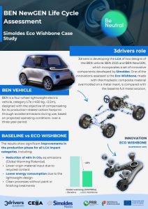 A 3drivers está a realizar a Avaliação do Ciclo de Vida (ACV) para quantificar o desempenho ambiental de ambas as configurações do veículo, permitindo uma comparação transparente entre a solução de base e as inovações do BEN NewGEN. Entre estes desenvolvimentos, um dos componentes destacados é o Eco Wishbone, desenvolvido pela Simoldes, cujas principais características e benefícios ambientais se encontram na figura abaixo.